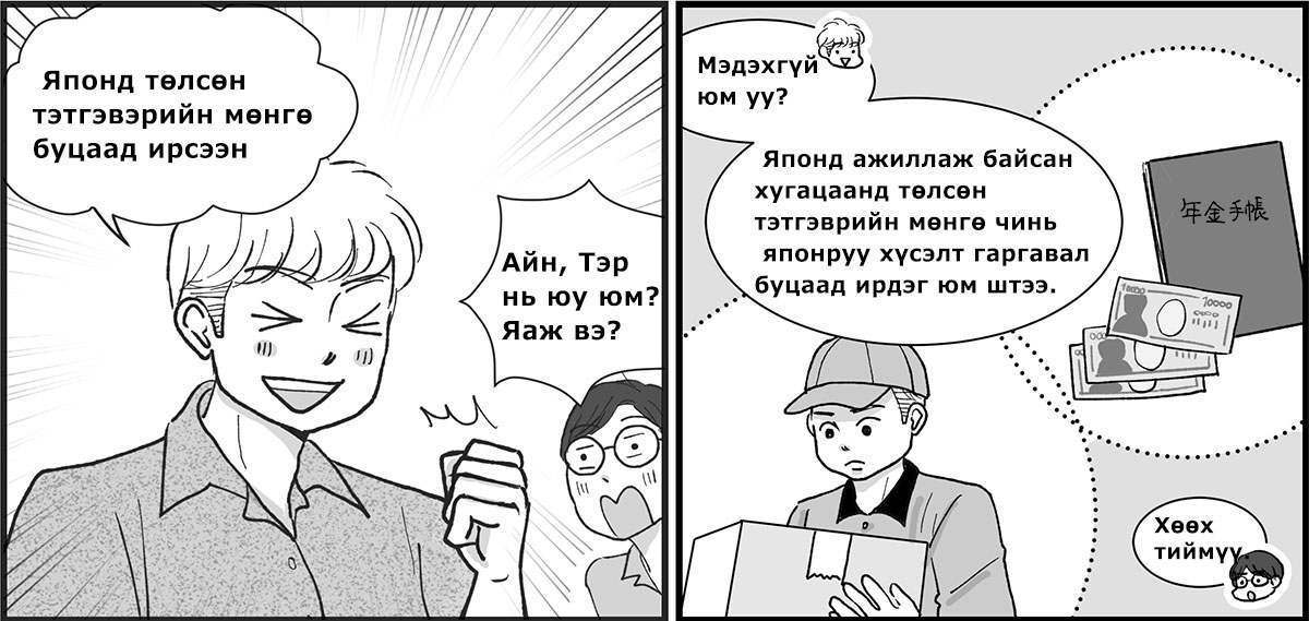 Японы компанид 6 сараас дээш хугацаагаар ажиллаж, халамжийн тэтгэврийн даатгалын мөнгө төлсөн бол нутаг буцсаны дараа Японы Тэтгэврийн албанд хандан нэхэмжлэл гаргаснаар даатгалын шимтгэлийн тодорхой хувийг буцаан авах боломжтой систем юм. Японоос гараад 2 жилийн дотор нэхэмжлэл гаргах шаардлагатай. Нэмж дурдахад, буцаан олголтын 20 орчим хувь нь орлогын албан татвар болгон суутгагддаг.